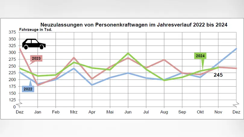 244,544 new passenger cars were registered in November 2024 according to the KBA. At -0.5 percent, the registration volume was almost at the same level as the same month of the previous year. New commercial registrations rose by +4.3 percent, accounting for 68.0 percent of the total. Private new registrations fell by -9.3 percent in the month under review.