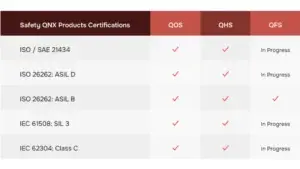The new QOS real-time operating system and the QNX hypervisor are already certified in accordance with the most important safety standards (QHS). The QNX Filesystem for Safety (QFS) is ASIL B certified - further certifications are in progress. © QNX