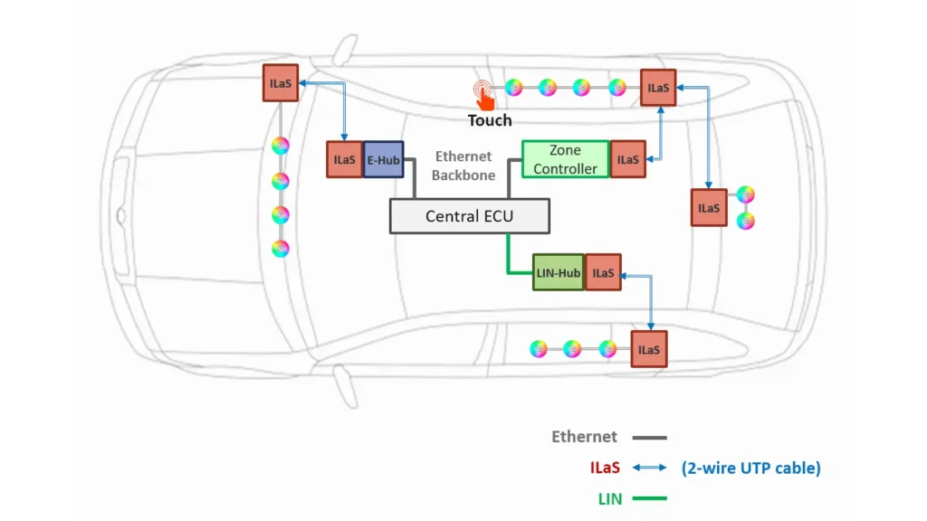 ILaS kam 2022 als Ergänzung hinzu und verlagert die Intelligenz von dezentralen Controllern auf eine zentrale Einheit. Alle Daten laufen über einen Access Point in das Netzwerk, was Software-Updates over-the-air und modulare Erweiterungen ermöglicht. Das System ist inzwischen serienreif. Beispielsweise nutzt Hyundai Kia es in einer domänenorientierten Architektur, BMW setzt ILaS im neuen iX3 ein. Über Automotive Ethernet gibt es nur eine einzige Schnittstelle zum Fahrzeug – alles Weitere läuft über ILaS und ist damit ohne zusätzlichen Compute Overhead und Software.