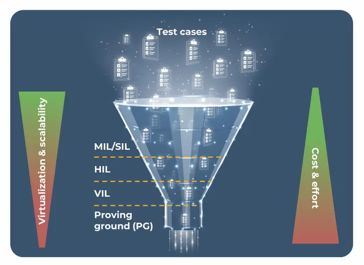 Die Wirtschaftlichkeit hängt maßgeblich von der gewählten Teststrategie ab. Klassische, stark hardwaregetriebene Ansätze sind teuer, zeitaufwendig und nur begrenzt skalierbar. Tests auf dem Prüfstand oder auf dem Testgelände lassen sich kaum parallelisieren und stoßen angesichts der heutigen Funktionsvielfalt schnell an ihre Grenzen.