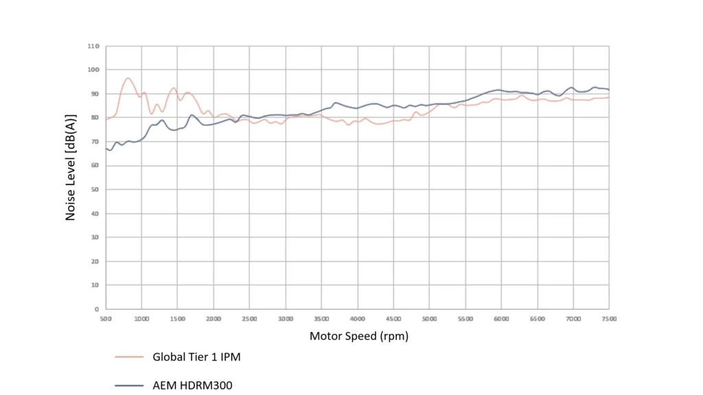 Auch einem weiteren Nachteil der frühen Reluktanzmotoren, den Geräuschemissionen, hat sich AEM angenommen. Tests in einem reflexionsarmen Raum haben gezeigt, dass der HDRM300 durch die getroffenen Maßnahmen hinsichtlich des A-bewerteten Schalldruckpegels (dBA) mit einem IPM-Traktionsmotor vergleichbar ist – auch hinsichtlich der Drehmomentwelligkeit, da kein Cogging beim Abschalten auftritt.