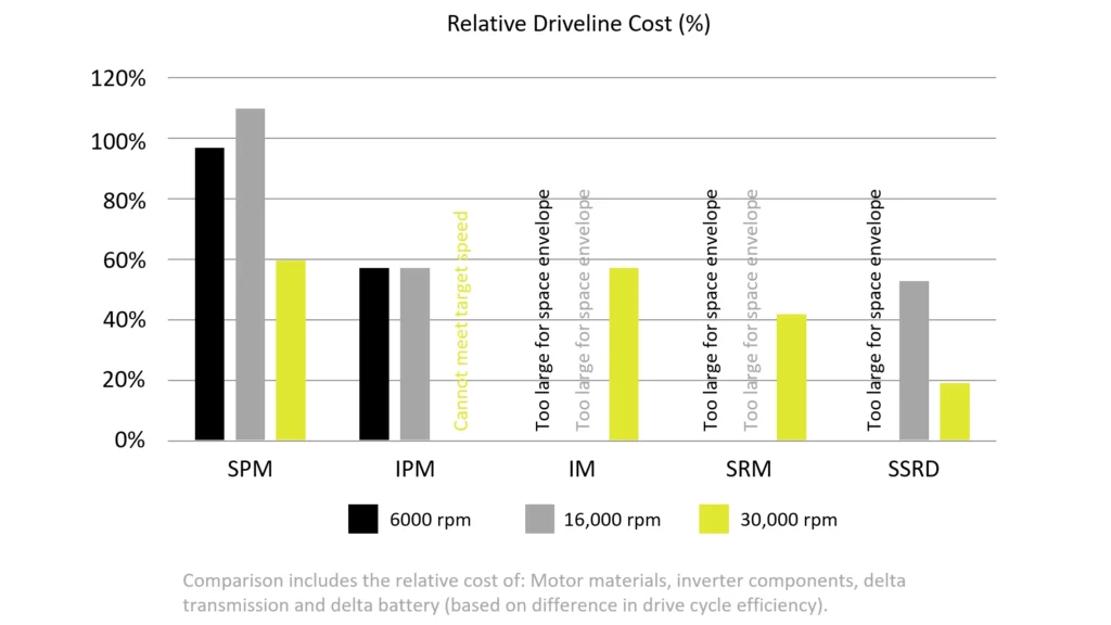 Die jüngste Entwicklung von AEM markiert den Einstieg in den Bereich der Pkw-Traktionsmotoren. Zu den Entwicklungszielen gehörten minimale Kosten für den gesamten Antriebsstrang (Motor, Getriebe, Umrichter, Batterie): Der SSRD (Super Speed Reluctance Drive).