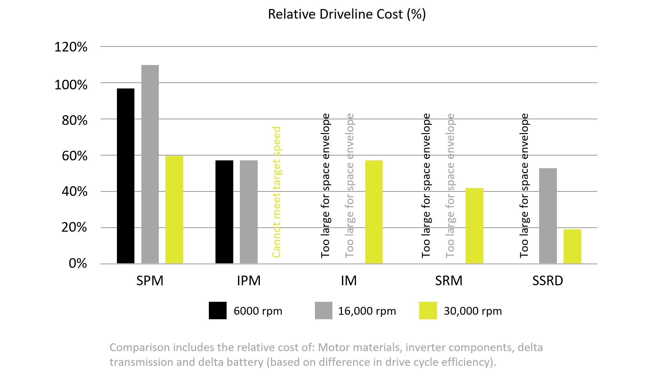 Für die 2025/26 geplanten OEM-Demofahrzeuge ist der Motor für Drehzahlen bis zu 30.000 U/min spezifiziert. In einer gemeinsam mit einem OEM und zwei Tier-1-Unternehmen finanzierten Studie wurden verschiedene Rotortopologien verglichen. Sie stellte die Kosten des gesamten Antriebsstrangs gegenüber und zeigte, dass die SSRD-Technologie den kostengünstigsten Antriebsstrang mit der geforderten volumetrischen Leistungsdichte (ca. 29 kW/L) und gleichzeitig die beste Umweltbilanz bietet. Für die von AEM für 2025 angekündigten Prototypen des SSRD-Motors erwartet das Unternehmen eine Dauerleistung von 138 kW bei 30.000 U/min und eine Volumenleistungsdichte von 35,4 kW/l bzw. eine Massenleistungsdichte von 10 kW/kg.
