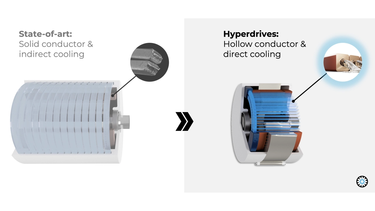 Hyperdrives hat die etwa 100 Jahre alte Grundidee der Kühltechnik von Großgeneratoren aufgegriffen und auf IPM-Traktionsmotoren mit Nennleistungen ab 50 kW für die Fahrzeugindustrie übertragen. Die mit Kühlmittel durchflossenen Hohlleiter-Hairpins ermöglichen eine Direktkühlung der Statorwicklung – also genau dort, wo bei Volllast die höchste Verlustleistung eines Elektromotors von weit über 90 % anfällt. Das bringt gleich mehrere entscheidende Vorteile: