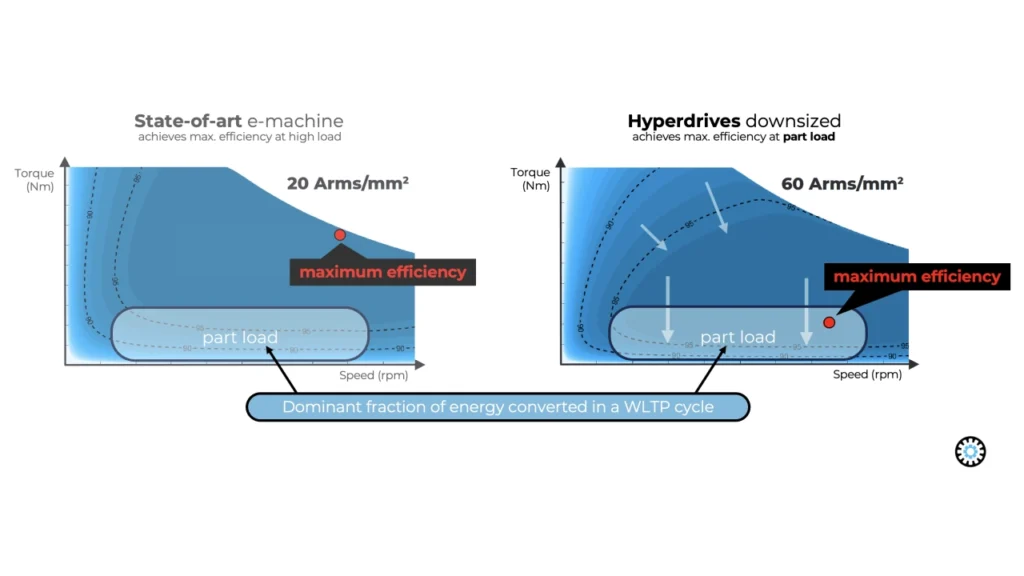 Wirkungsgradkennfeld eines konventionell gekühlten Elektromotors im Vergleich zum Kennfeld eines auf Teillast optimierten Hyperdrives-Motors. Im Teillastbereich erreicht der Hyperdrives-Motor einen Wirkungsgrad von über 98 %. Bei höheren Stromdichten sind es 95 % und mehr. Im WLTP-Zyklus erreicht der Antrieb mit Hyperdrives-Technik eine um bis zu 10 % höhere Effizienz, da dort – wie im realen Betrieb – die Fahrtphasen mit Teillastbetrieb überwiegen. ©Hyperdrives