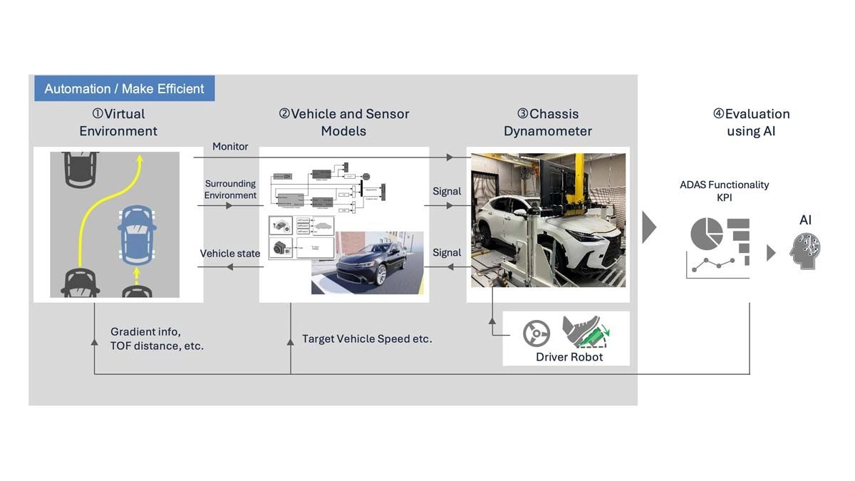 Die Architektur des ViL-Simulators ADAS-RCS von Toyota, der reale und virtuelle Welten über einen Fahrgestellprüfstand mit einem Co-Simulationsblock verbindet. © Toyota