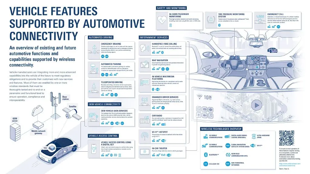 Das von Rohde & Schwarz bereitgestellte Poster beschreibt die wichtigsten Funktionen von Fahrzeugen und listet die zugehörigen drahtlosen Standards auf. Es ist in Kategorien wie Infotainment, automatisiertes Fahren und Überwachung unterteilt und gibt einen Überblick über bestehende und zukünftige Automobilfunktionen, die von drahtloser Konnektivität wie z. B. UWB, 5G, Bluetooth und DAB unterstützt werden, von Notruf bis In-Car-Theater und teleoperiertem Fahren. (oe)