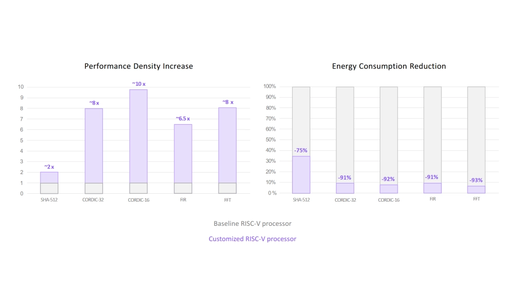Anschließend (ab 5:47) zeigt der Referent anhand von fünf Anwendungen, dass durch die Integration von anwendungsspezifischen Befehlen (Codasip nennt das „Custom Compute“) eine bis zu 10-fach höhere Rechenleistung und eine bis zu 93 % reduzierte Leistungsaufnahme erreicht werden kann.