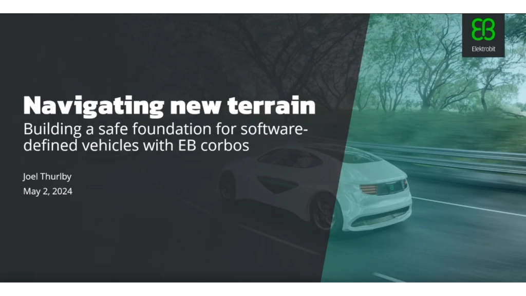 Das Webinar „Navigating new terrain” von Elektrobit stellt die Grundzüge der Lösung EB corbos vor. Dabei handelt es sich um eine zentralisierte Plattform für Automotive Software mit unterschiedlichen Sicherheitsanforderungen (mixed critical software), die aus drei Hauptkomponenten besteht: EB corbos AdaptiveCore, EB corbos Linux, EB corbos Hypervisor.