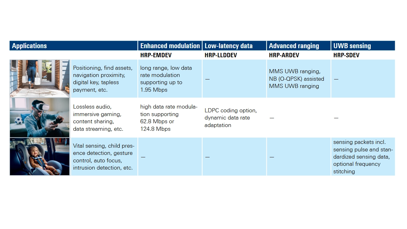 Auf den ersten elf Seiten des Papers werden nach einer kurzen allgemeinen Einführung die neuen Funktionen erklärt. Dazu gehören das weiterentwickelte Modulationsverfahren, der Datenservice mit niedrigen Latenzzeiten und anpassbaren Datenraten sowie die verbesserten Entfernungsmessungen. Ebenfalls vorgestellt werden die neuen Möglichkeiten für die radarbasierte Sensorik und der neue Wake-up-Energiesparmodus.