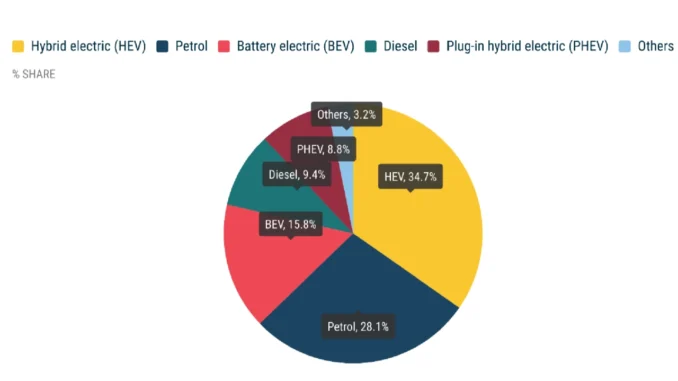 Die Neuzulassungen von Hybrid-Elektroautos stiegen in der EU auf 2.485.069 Einheiten. Dieses Wachstum wurde durch die vier größten Märkte angetrieben: Frankreich (+30,5 %), Spanien (+29,3 %), Deutschland (+10,1 %) und Italien (+9,4 %). Hybrid-Elektro-Modelle machen 34,7 % des gesamten EU-Marktes aus.