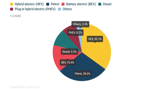 Mit bisher 1.305.525 neu zugelassenen Fahrzeugen sank der Marktanteil von Benzinfahrzeugen von 35,6 % auf 28,6 %. Der Markt für Dieselfahrzeuge schrumpfte im gleichen Zeitraum um 26,6 %, sodass ihr Anteil im Mai 2025 seit Jahresbeginn bei 9,5 % lag.