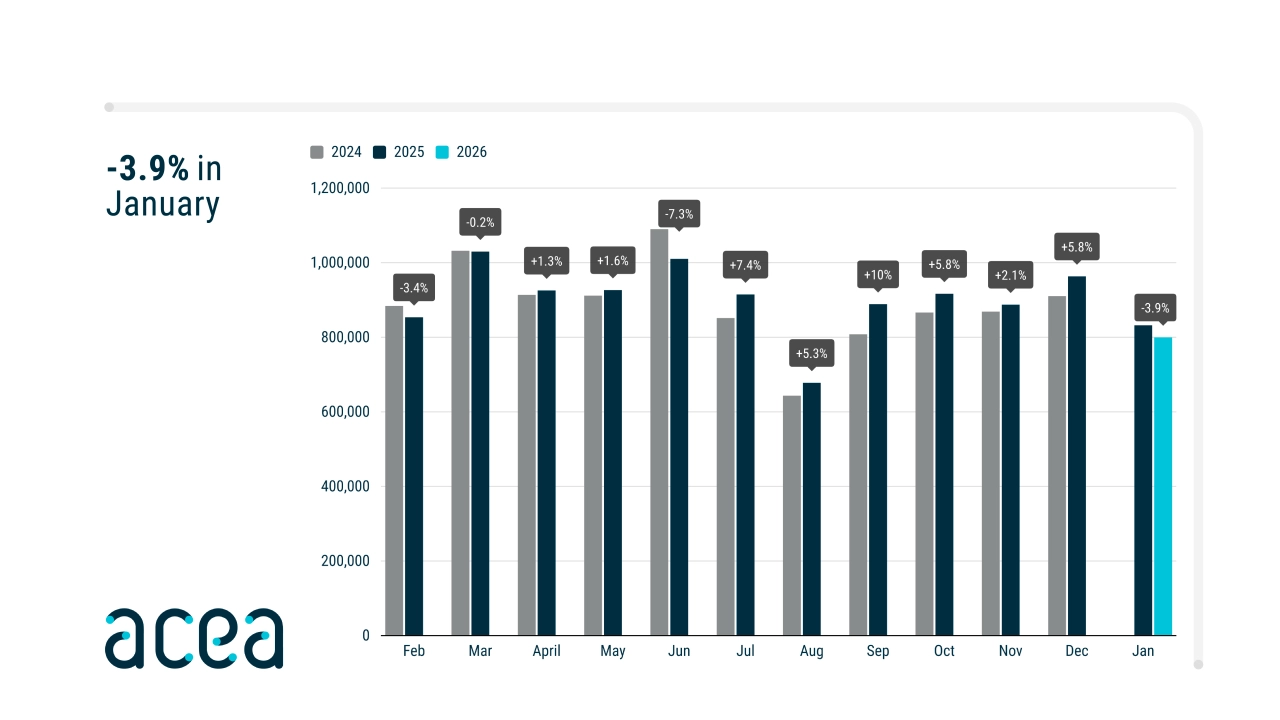 Laut ACEA wurden im Januar 2026 in der EU 154.230 neue batterieelektrische Pkw (BEV) zugelassen, was einem Marktanteil von 19,3 % entspricht (im Januar 2025 waren es 14,9 %).