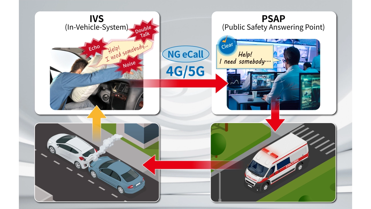 Die NG-eCall-Funktion erfordert eine hochwertige Sprachkommunikation mit geringer Latenz. Nach einer Kollision werden Anrufe innerhalb des Fahrzeuginnenraums über eine Freisprecheinrichtung getätigt. Dabei können hohe Geräuschpegel, Echos und andere akustische Herausforderungen die Sprachverständlichkeit erheblich beeinträchtigen.