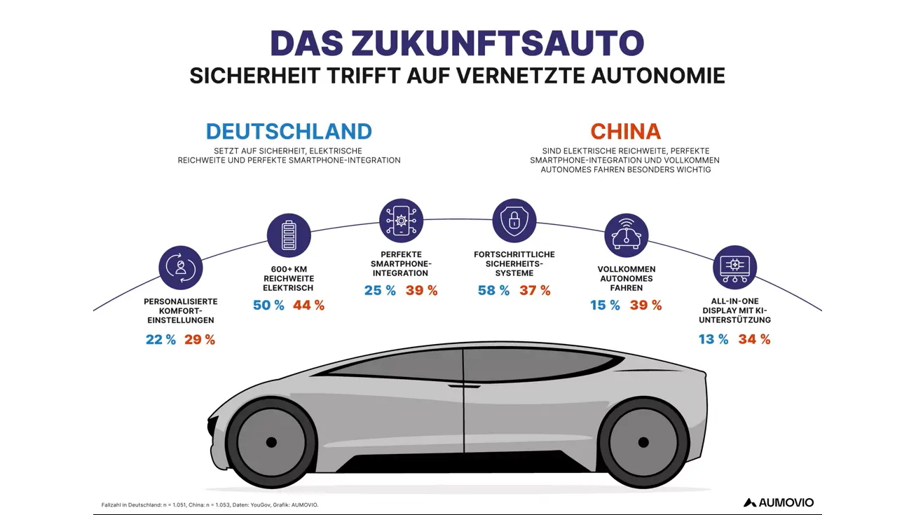 Der aktuelle AUMOVIO Mobility Report zeigt deutliche Unterschiede in den Präferenzen von Autofahrern in Deutschland und China. Während deutsche Konsumenten beim Fahrzeug der Zukunft vor allem auf Sicherheit und Reichweite Wert legen, stehen für chinesische Autofahrer innovative Technologien und Funktionen für autonomes Fahren im Vordergrund.