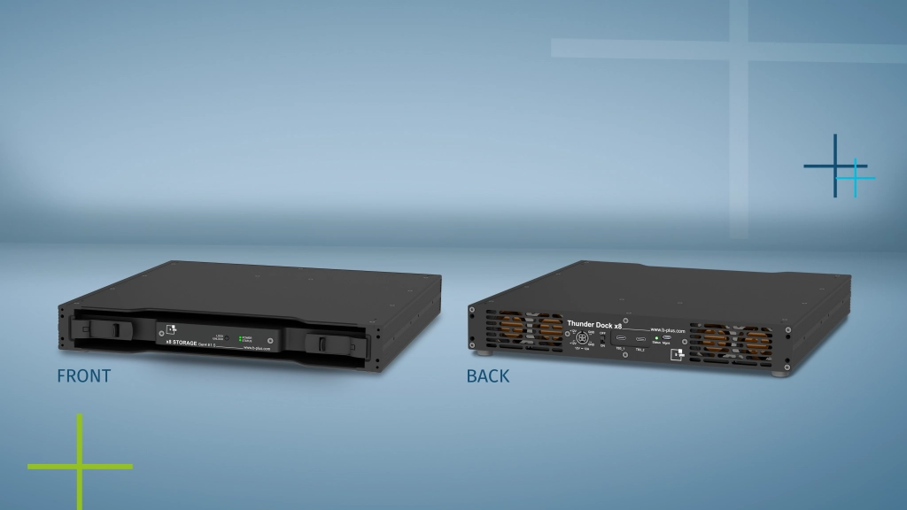 Die Thunder Dock x8 von b-plus erlaubt eine stabile, sichere und schnelle Verbindung zu x8 STORAGE Wechselspeichern des Unternehmens. Ausgestattet mit Thunderbolt 3 Schnittstellen erreicht das System Übertragungsraten von bis zu 20 Gbit/s, wodurch der Transfer großer Datenmengen nahtlos und effizient wird. Die aktive Kühlung und beidseitige Belüftung sorgen dafür, dass die Speichereinheiten auch unter intensiver Last optimal temperiert bleiben. was die Dockingstation besonders für datenintensive Prozesse oder auch Ingest-Prozesse prädestiniert.