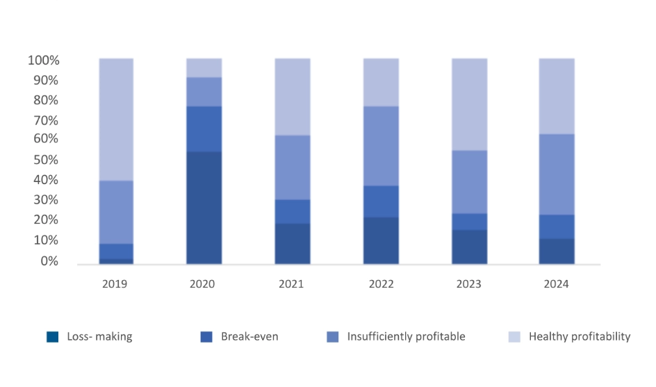 Die europäische Automobilzulieferindustrie schloss laut einer von der CLEPA in Zusammenarbeit mit McKinsey halbjährlich durchgeführten Umfrage das Jahr 2023 mit einer weiterhin geringen Rentabilität ab. 65 % der Unternehmen kämpfen mit Gewinnmargen von unter 5 %, einer kritischen Schwelle für die Sicherung nachhaltiger Investitionen und die Aufrechterhaltung der europäischen Wettbewerbsfähigkeit. 25 % der Befragten meldeten Gewinne von unter 1 % oder sogar eine negative Rentabilität. Trotz dieses Drucks geht die Zahl der Unternehmen, die Verluste verzeichnen, allmählich zurück, was die Widerstandsfähigkeit und Anpassungsfähigkeit des Sektors unterstreicht.