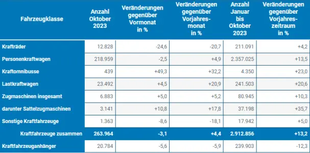 Deutsche Hersteller verzeichneten gegenüber dem Oktober 2022 überwiegend gestiegene Neuzulassungszahlen. Mit einem Neuzulassungsanteil von 28,6 Prozent bildeten SUVs (+2,2 %) erneut das stärkste Segment, gefolgt von der Kompaktklasse (17,1 %/+4,9 %), den Geländewagen (12,2 %/+7,8 %), den Kleinwagen (12,0 %/+7,1 %) und der Mittelklasse (11,1 %/+14,4 %). Die Oberklasse verzeichnete mit einem Zuwachs von +31,0 Prozent den größten Zulassungsanstieg, ihr Anteil betrug im Berichtsmonat 1,1 Prozent.