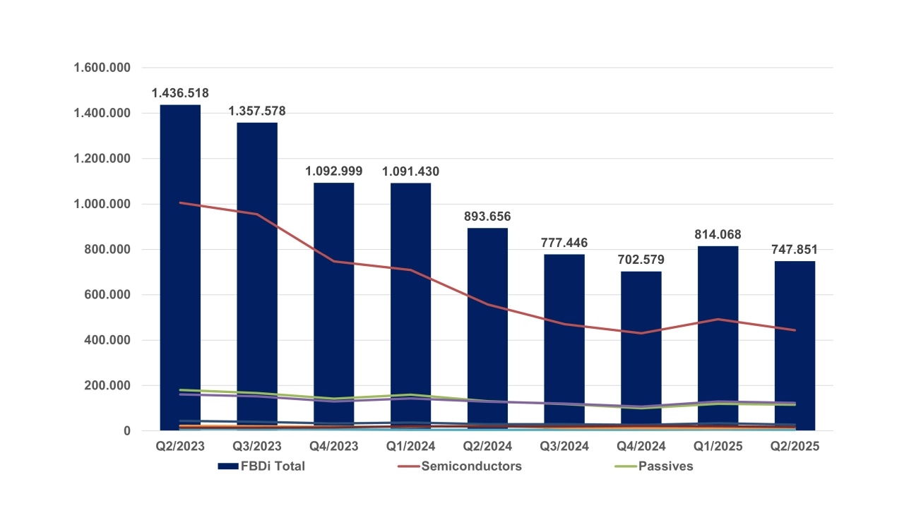 Laut dem FBDi ging der Umsatz der Elektronik-Bauelemente-Distribution in Deutschland im zweiten Quartal 2025 um knapp 8 % auf 748 Mio. Euro zurück. Gegenüber dem Vorjahresquartal beträgt der Rückgang 16,3 %. Auch der Auftragseingang gab gegenüber dem ersten Quartal beinahe um 9 % nach. Die Aussichten bleiben unsicher.