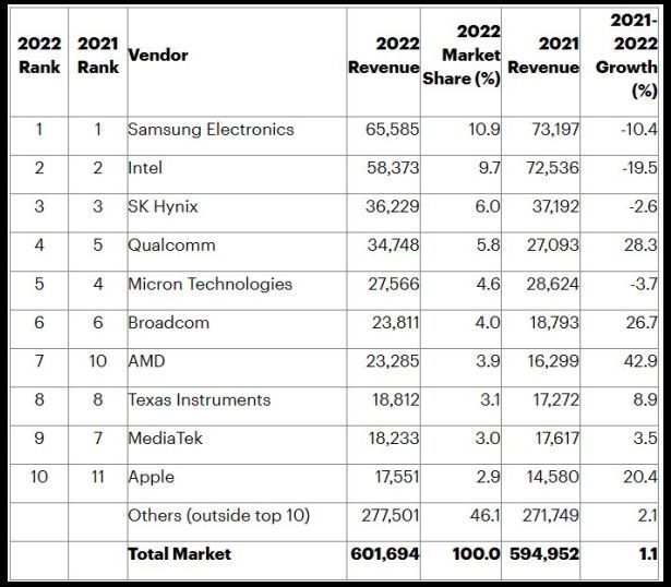 Bei den Top10-Halbleiterhersteller behauptete Samsung Electronics seinen Spitzenplatz, obwohl der Umsatz im Jahr 2022 um 10,4 % zurückging, was in erster Linie auf Rückgänge bei den Verkäufen von Arbeitsspeichern und NAND-Flashs zurückzuführen ist (siehe Tabelle 1). Intel behauptete sich mit einem Marktanteil von 9,7 % auf Platz 2. Das Unternehmen litt unter dem erheblichen Rückgang des Marktes für Consumer-PCs und dem starken Wettbewerb in seinem Kerngeschäft mit x86-Prozessoren; das Umsatzwachstum ging um 19,5 % zurück.