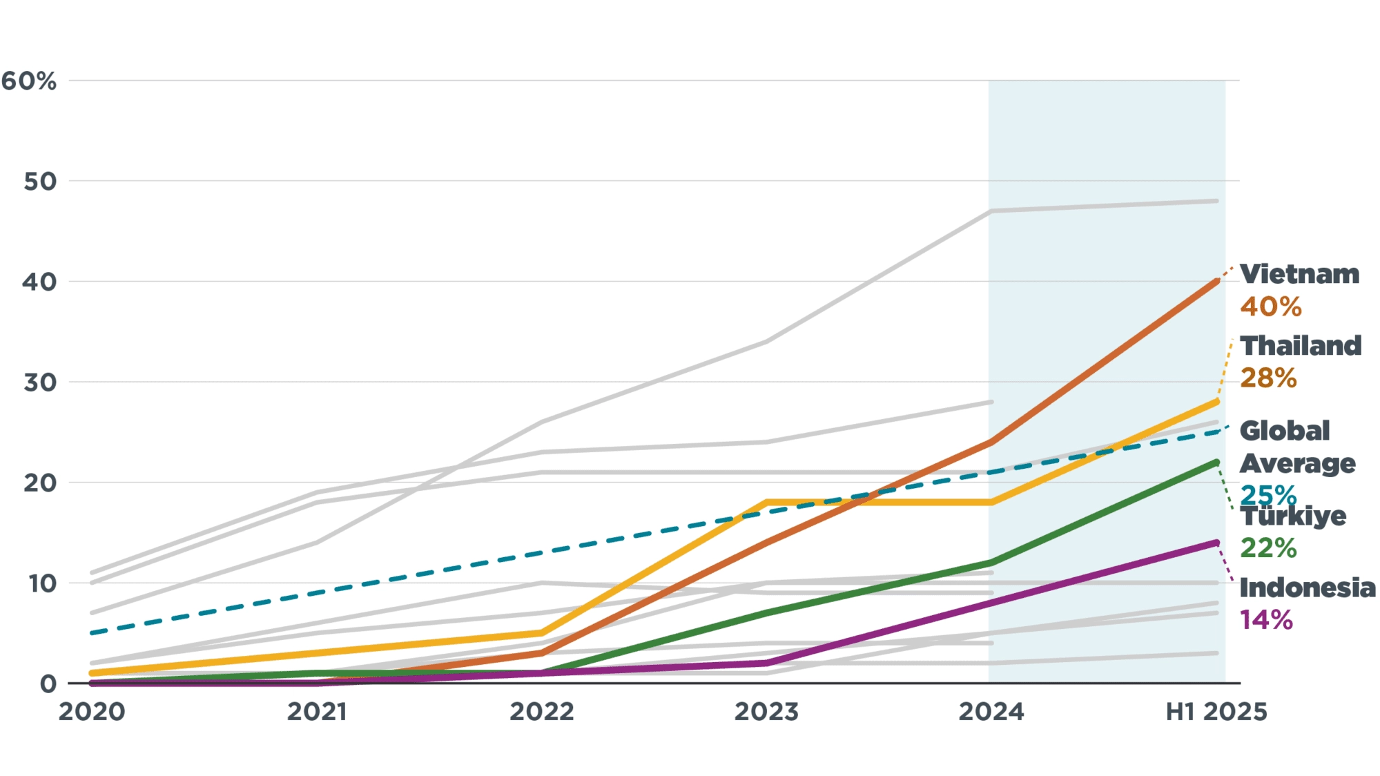 Mit einem bemerkenswerten Elektro-Pkw-Anteil von 40 % im ersten Halbjahr 2025 führt Vietnam die Schwellenländer an, nachdem dieser Anteil 2020 noch bei nahezu null lag. Dies ist auf den einheimischen Hersteller VinFast und eine unterstützende Fiskalpolitik zurückzuführen. In Thailand betrug der Absatzanteil von Elektrofahrzeugen 28 %, in der Türkei 22 % und in Indonesien 14 %. Damit übertrafen die Länder die globale durchschnittliche Wachstumsrate. Diese Märkte profitieren von einer Kombination aus günstigen fiskalischen Maßnahmen, einer starken heimischen Produktion und kostengünstigen Importen aus China.