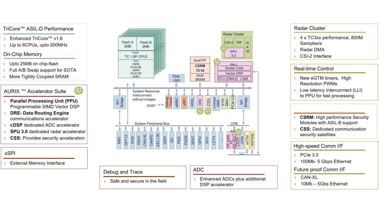 Der AURIX TC4Dx von Infineon verfügt über eine fortschrittliche Multi-Core-Architektur mit dem neuen 500MHz TriCore mit sechs Kernen, die alle im Lock-Step-Verfahren für funktionale Sicherheit arbeiten. Mit einer Parallel Processing Unit (PPU) bietet die MCU eine Plattform für die Entwicklung eingebetteter KI-basierter Anwendungsfälle und Automotive-Anwendungen wie Motorsteuerung, Batteriemanagementsysteme oder die Fahrzeugbewegungssteuerung. Die MCU wird von einem starken Software-Partner-Ökosystem unterstützt und umfasst Netzwerkbeschleuniger zur Verbesserung der Ethernet- und CAN-Kommunikation sowie die neuesten Kommunikationsfunktionen wie 5-Gbit/s-Ethernet, PCIe, 10Base-T1S und CAN-XL. Dieser erhöhte Netzwerkdurchsatz und die Konnektivität bieten Kunden die Leistung und Flexibilität, die sie für die Implementierung von E/E-Architekturen benötigen. Der ganzheitliche Ansatz des AURIX TC4Dx zur funktionalen Sicherheit genügt den höchsten Anforderungen an die funktionale Sicherheit nach ISO26262 ASIL-D. Die MCU erfüllt auch die neuesten Cybersicherheitsstandards nach ISO/SAE21434, einschließlich Unterstützung von Post-Quantum-Kryptographie. Der AURIX TC4Dx ist derzeit in Mustern erhältlich und wird im Jahr 2025 in die Massenproduktion gehen. (jr)