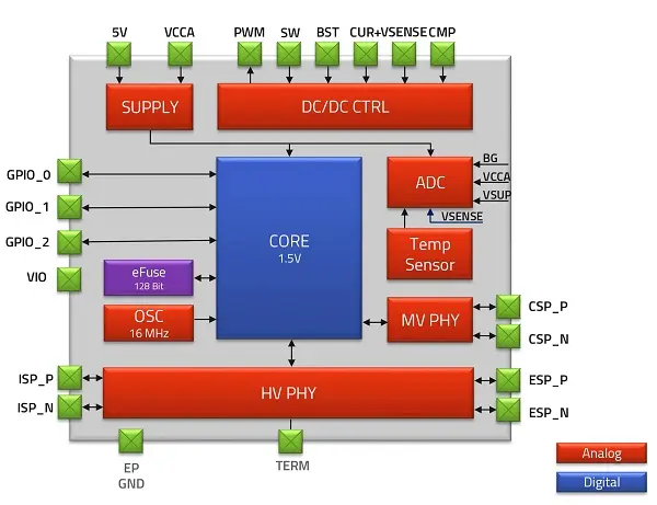 Inova Semiconductors bietet den Mixed-Signal-Transceiver INLT220Q für ISELED Licht- und Sensornetzwerke, der über mehrere Meter UTP-Kabel eine Daisy-Chain-Verbindung mit 2 Mbit/s und geringer Latenz aufbaut. Ein solches verzweigtes Netzwerk kann aus bis zu 4079 einzeln adressierbaren Knotenpunkten bestehen. Über drei zusätzliche GPIOs können Taster und Schalter als auch Aktoren wie Vibrationsmotoren für haptisches Feedback angesteuert werden. Der integrierte CD/DC-Buck-Controller ermöglicht eine direkte Spannungsversorgung aus der Batterie. Darüber hinaus ist ein OTP-Speicher integriert, in dem Anwender neben Produktinformationen (Hersteller-ID, Losnummer etc.) auch Netzwerkadressen hinterlegen können. Dadurch lassen sich auch bei Ausfällen von einzelnen Komponenten die restlichen Netzwerkteilnehmer weiterhin ansteuern, ohne die Adressierungstabelle in der Software anpassen zu müssen. Muster und Kleinmengen des IC können schon bezogen werden. (oe)