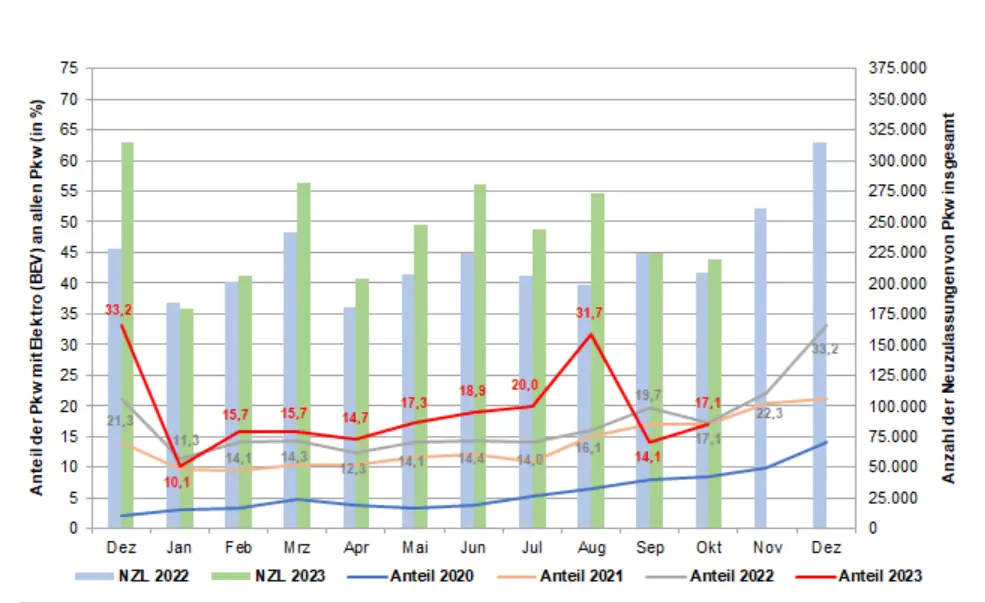 Nach zehn Zulassungsmonaten des Jahres 2023 lag die Anzahl der Personenkraftwagen (Pkw) laut KBA mit alternativen Antrieben (BEV, Hybrid, Plug-In, Brennstoffzelle, Gas, Wasserstoff) um +18,2 Prozent über dem Ergebnis des Vorjahreszeitraums. 1.125.182 Neuwagen und damit 47,7 Prozent der insgesamt 2.357.025 Pkw-Neuzulassungen waren damit ausgestattet. 564.584 Neuwagen, beziehungsweise 24,0 Prozent, waren mit einem Elektroantrieb (BEV, Plug-In, Brennstoffzelle) ausgestattet und damit +1,4 Prozent mehr als im Vergleichszeitraum 2022. Bei den BEV-Pkw stiegen die Zulassungszahlen im Vergleich zum Vorjahreszeitraum um +37,8 Prozent. Mit 424.623 Einheiten betrug ihr Anteil am Gesamtzulassungsvolumen des Berichtszeitraums 18,0 Prozent. (jr)