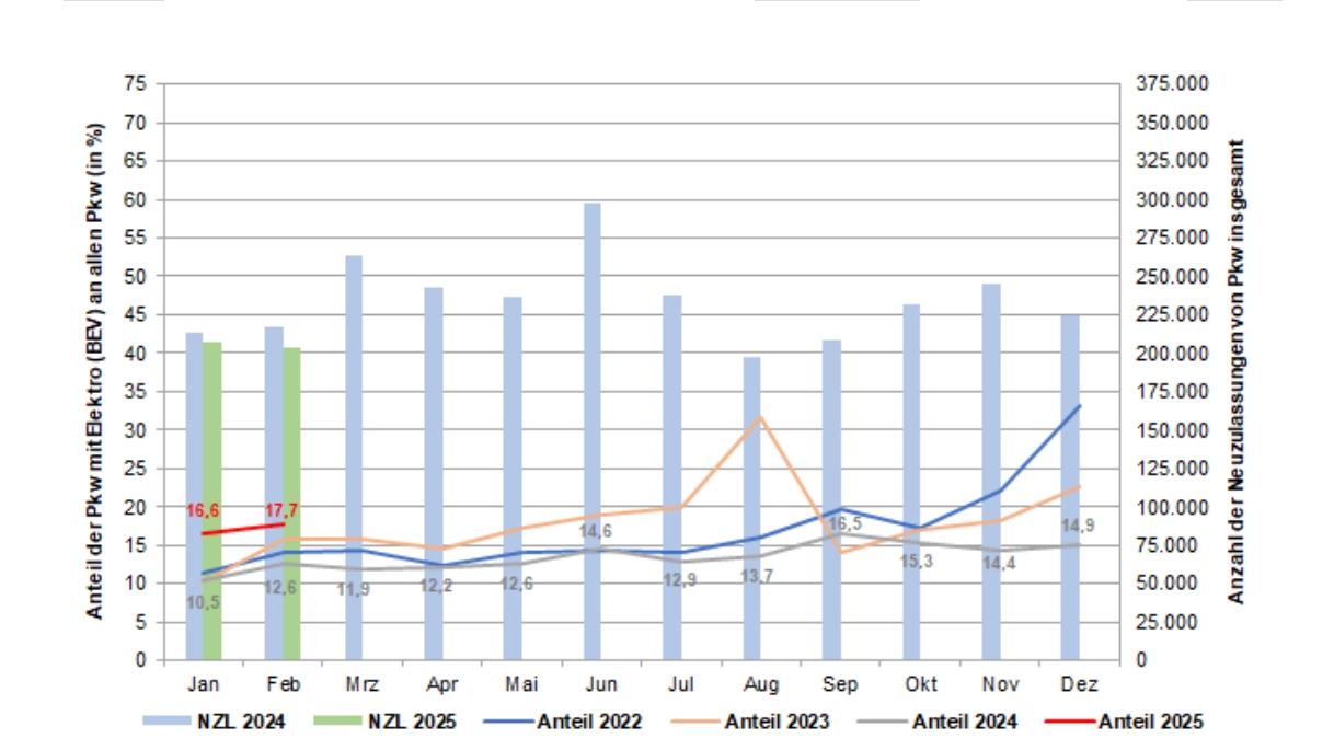 Im Berichtszeitraum wurden 70.447 rein elektrisch angetriebene (BEV) Pkw zugelassen und damit +41,0 5 mehr als im Vergleichszeitraum 2024. Ihr Anteil betrug 17,1 Prozent.