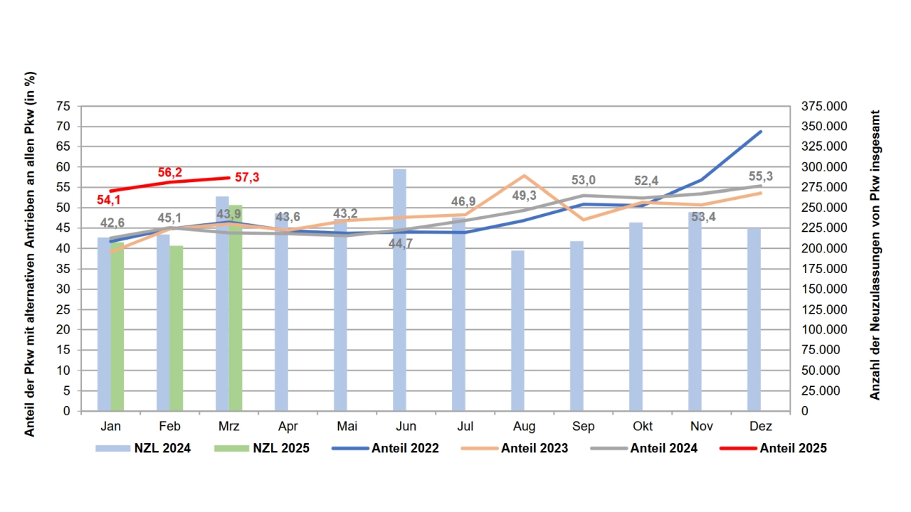 Mehr als die Hälfte der in Deutschland neu zugelassenen Pkw im ersten Quartal 2025 waren laut KBA mit einem alternativen Antrieb ausgestattet. Von insgesamt 664.571 Pkw-Neuzulassungen erreichten die alternativen Antriebe mit 371.918 Personenkraftwagen (Pkw) im Berichtszeitraum einen Anteil von 56,0 Prozent.