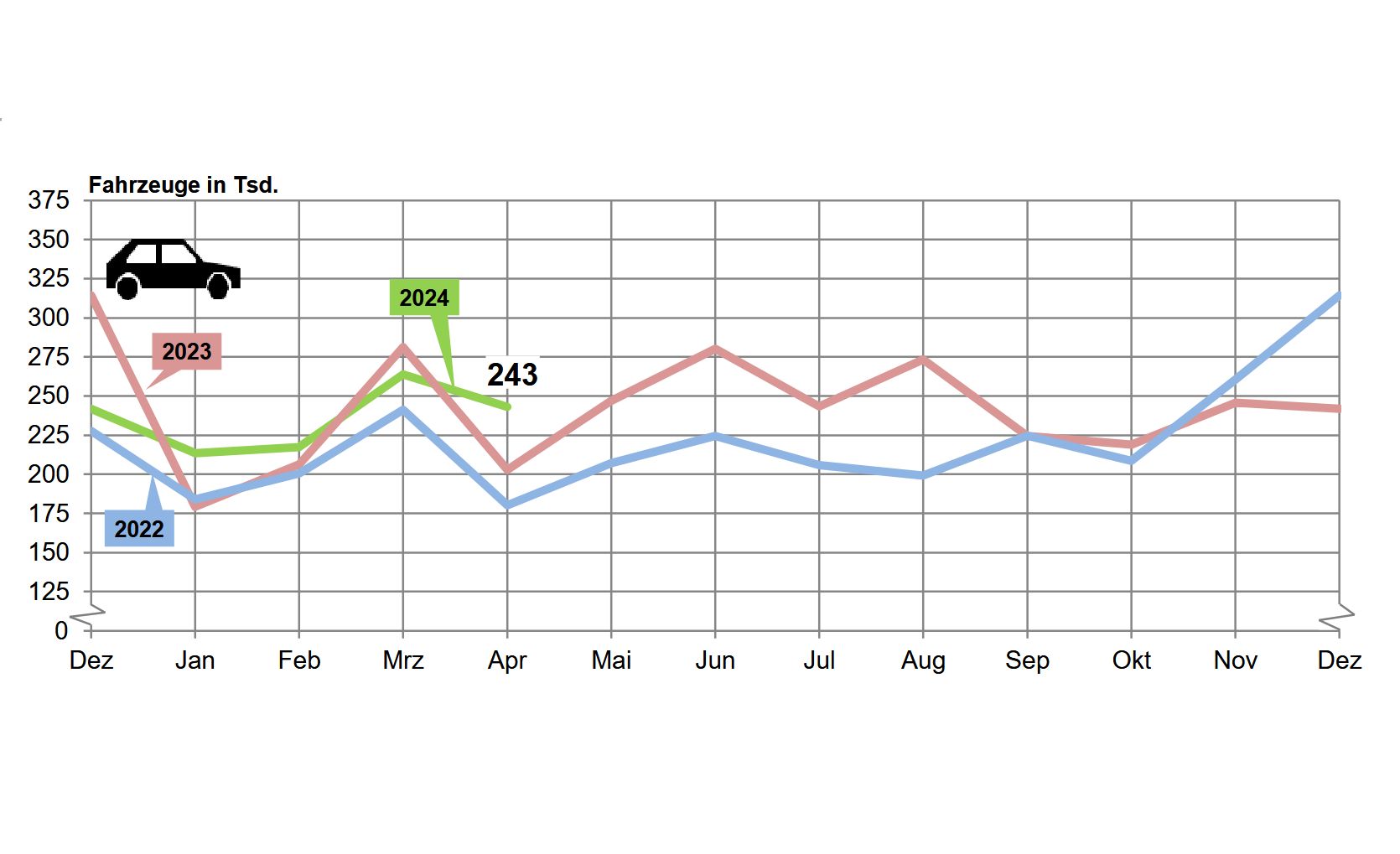 Pkw-Neuzulassungen im Jahresverlauf 2022 bis April 2024. ©KBA