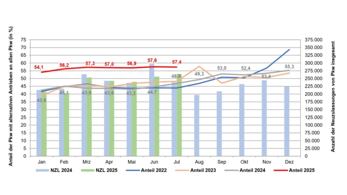 Von insgesamt 1.667.591 in den ersten sieben Monaten des Jahres in Deutschland neu zugelassenen Personenkraftwagen (Pkw) waren laut KBA 945.945 Neuwagen und damit 56,7 % mit einem alternativen Antrieb ausgestattet. Die Anzahl alternativ angetriebener Neuwagen (Elektro (BEV), Hybrid, Plug-in, Brennstoffzelle, Gas, Wasserstoff) überstieg das Niveau des Vorjahreszeitraums um +24,9 Prozent.