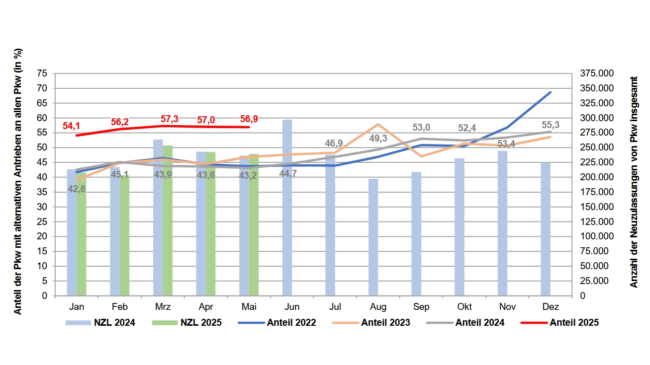 Insgesamt wurden in den ersten fünf Monaten dieses Jahres laut KBA in Deutschland 646.421 Neuwagen mit alternativen Antrieben (Elektro (BEV), Hybrid, Plug-in, Brennstoffzelle, Gas, Wasserstoff) zugelassen. Ihr Anteil am Gesamtneuzulassungsvolumen von 1.146.596 Personenkraftwagen betrug 56,4 Prozent. Die Anzahl alternativ angetriebener Neuwagen lag nach fünf Zulassungsmonaten im Jahr 2025 somit um 26,1 Prozent über dem Vergleichszeitraum des Vorjahres.