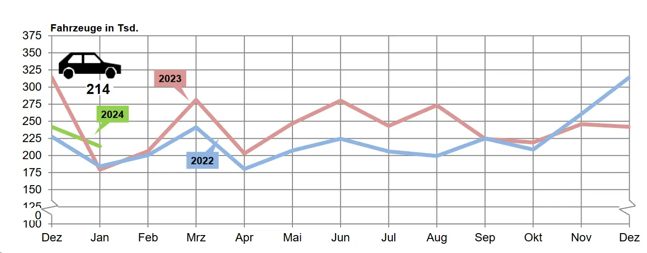 Im ersten Monat des Jahres 2024 verzeichneten die Neuzulassungen von Pkw laut KBA mit 213.553 Einheiten ein Plus von 19,1 % im Vergleich zum Vorjahresmonat. Die Anzahl der gewerblichen Neuzulassungen nahm um 23,3 Prozent zu, ihr Anteil betrug 70,7 %, die privaten Zulassungen (29,2 %) stiegen um 10,1 Prozent.