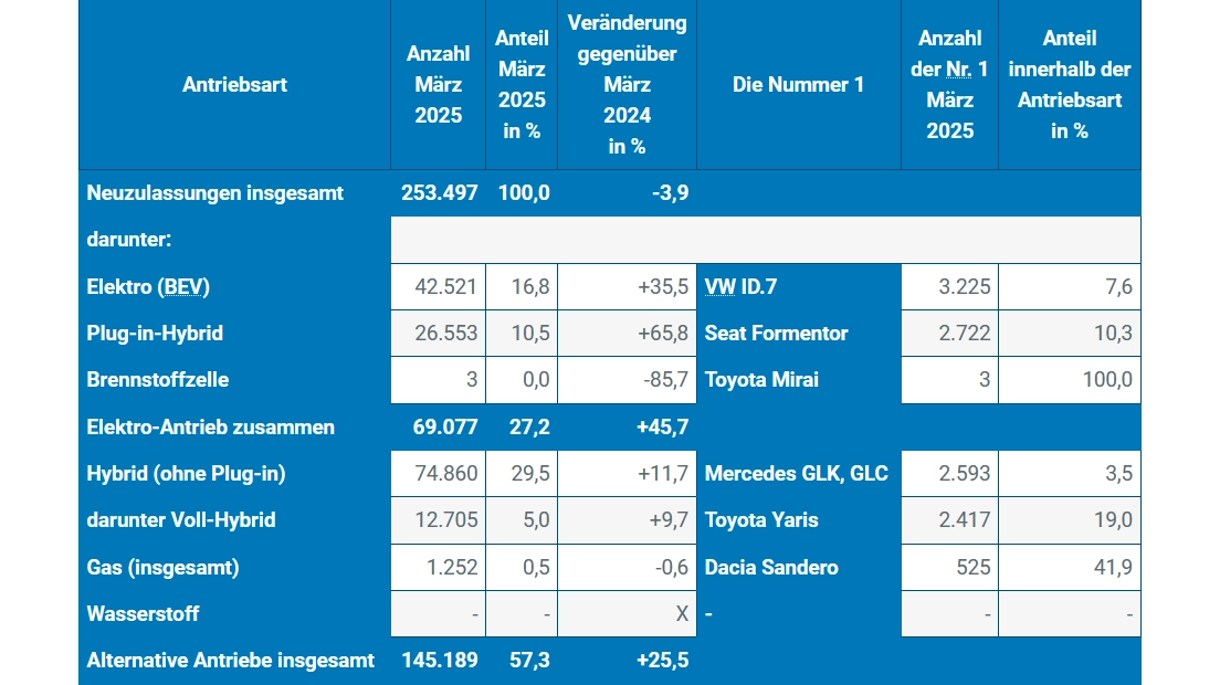 Bei den weiteren Antriebsarten zeigten sich die zulassungsstärksten Modelle des Vormonats. Die Antriebsart Elektro (BEV) wurde erneut vom VW ID.7 angeführt, bei der Antriebsart Brennstoffzelle war es weiterhin der Toyota Mirai. Die Antriebsart Hybrid (ohne Plug-in) wurde wiederholt vom Mercedes GLK, GLC angeführt und bei den Voll-Hybriden war es der Toyota Yaris. Zulassungsstärkstes Fahrzeug mit der Antriebsart Gas (insgesamt) war erneut der Dacia Sandero. Für die Antriebsart Wasserstoff wurden keine Neuzulassungen registriert. (jr)