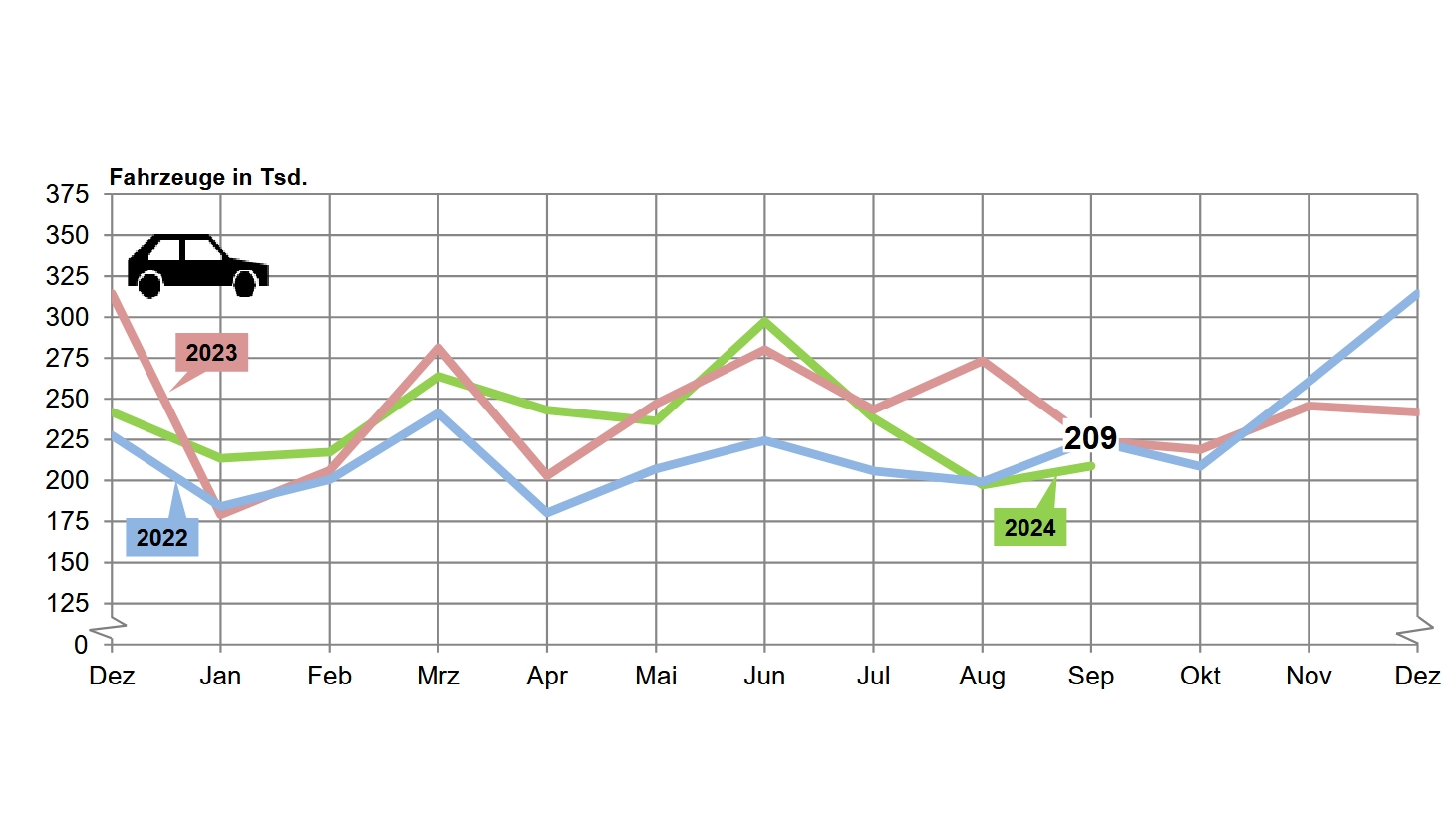 208.848 Personenkraftwagen (Pkw) wurden laut KBA im September 2024 neu zugelassen und damit 7,0 % weniger als im Vorjahresmonat. 67,0 5 (-6,8 %) der Neuwagen wurden gewerblich und 32,9 % (-7,2 %) privat zugelassen.