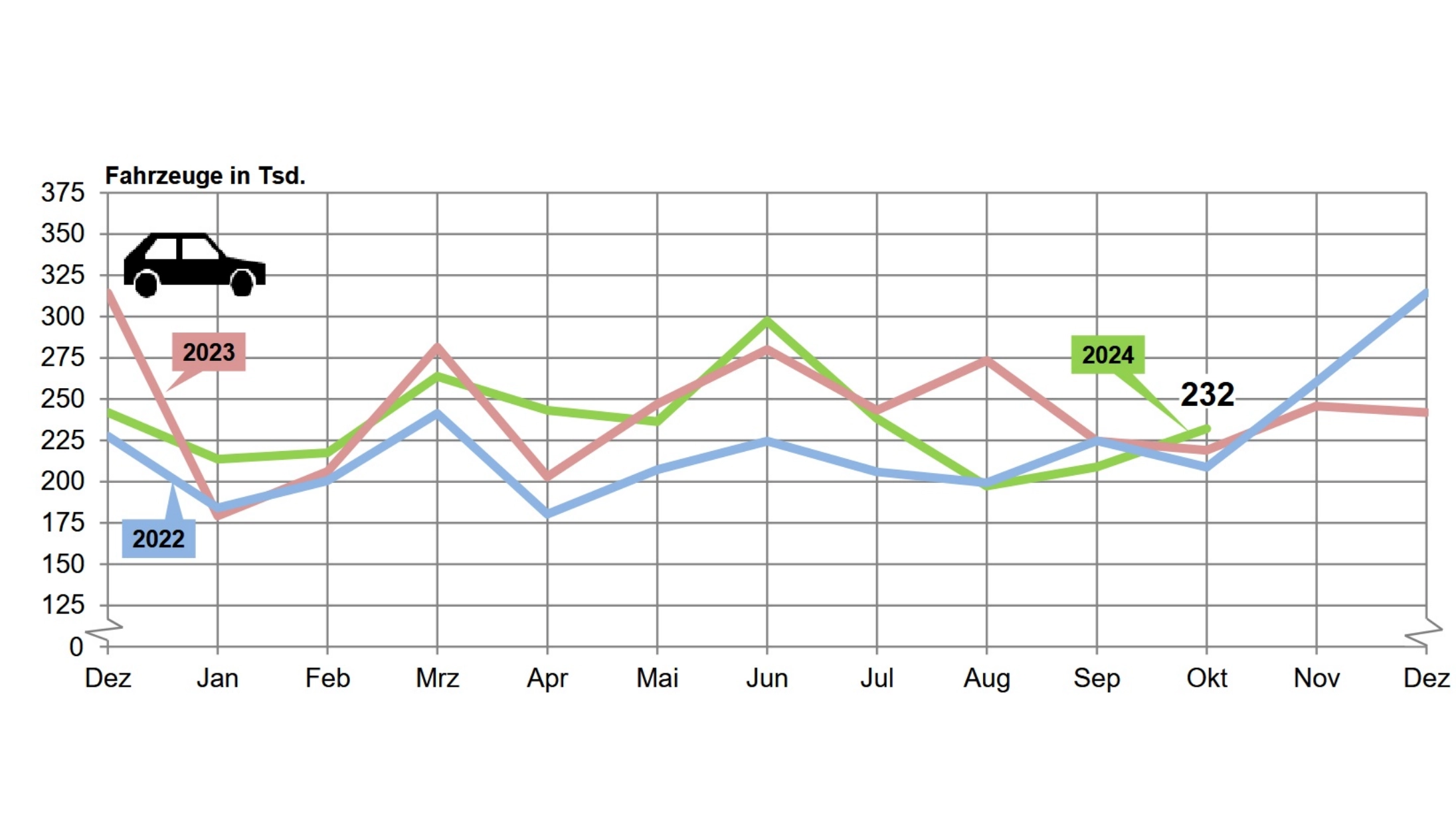 Pkw-Neuzulassungen in Deutschland im Jahresverlauf 2022 bis September 2024. ©KBA
