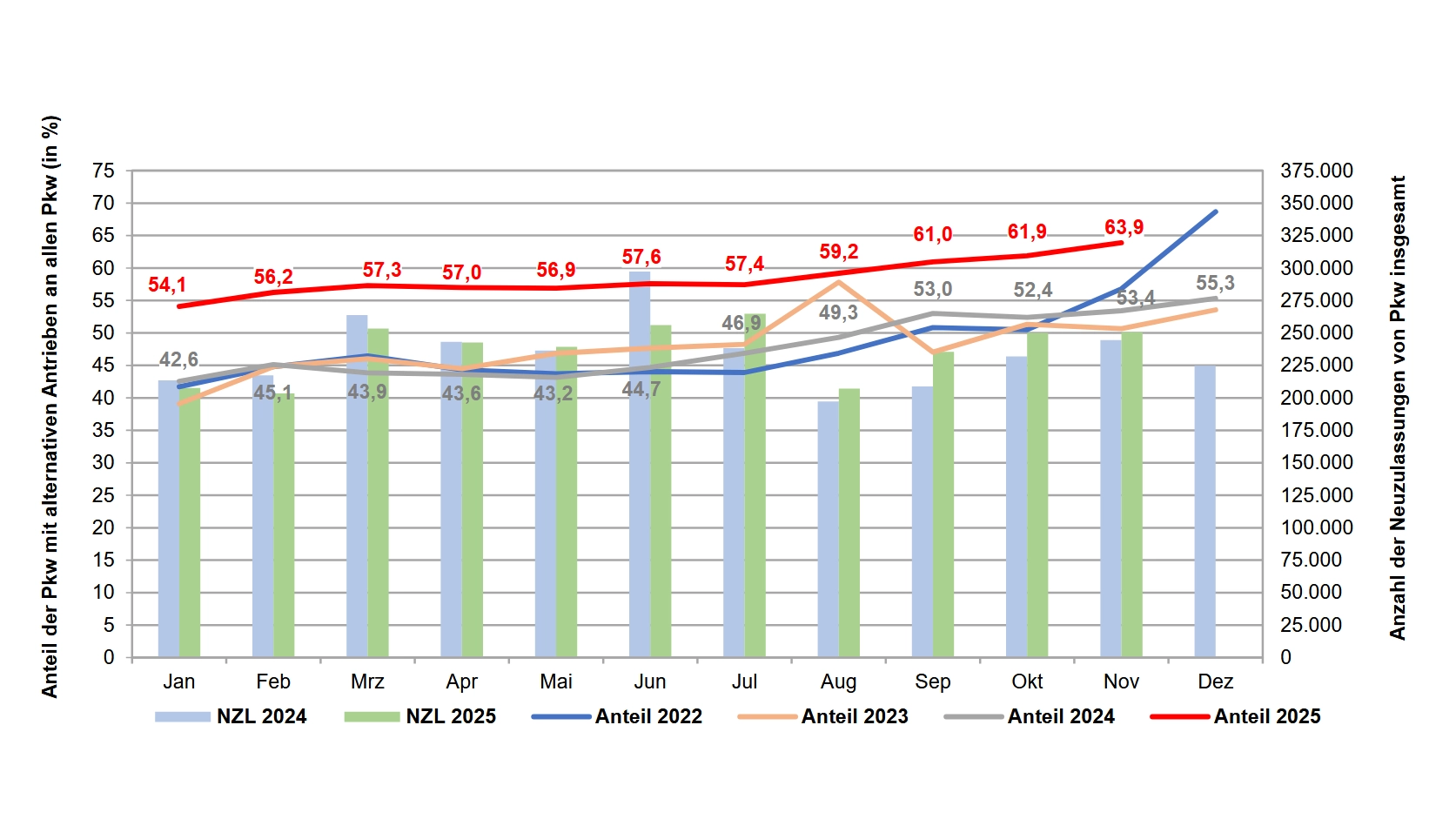In den Monaten Januar bis November 2025 wurden in Deutschland laut KBA 1.527.366 neue Pkw mit alternativen Antrieben zugelassen. Der Anteil von Neuwagen mit alternativen Antrieben am Gesamtneuzulassungsvolumen von 2.611.152 Neuwagen betrug 58,5 %. Nach elf Zulassungsmonaten lag die Anzahl alternativ angetriebener Neuwagen (Elektro (BEV), Hybrid, Plug-in, Brennstoffzelle, Gas, Wasserstoff) somit um +25,4 % über dem Vergleichszeitraum des Vorjahres.