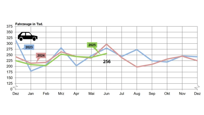 256.193 Personenkraftwagen wurden laut KBA im Juni 2025 in Deutschland neu zugelassen, das waren 13,8 % weniger als im Vorjahresmonat. Die Neuzulassungen für gewerblich Haltende nahm um 15,5 % ab, ihr Anteil betrug 67 %. Private Neuzulassungen sanken im Berichtsmonat um 10,2 %. Im ersten Zulassungshalbjahr 2025 wurden insgesamt 1.402.789 Neuwagen zugelassen und damit 4,7 % weniger als im Vergleichszeitraum des Vorjahres.