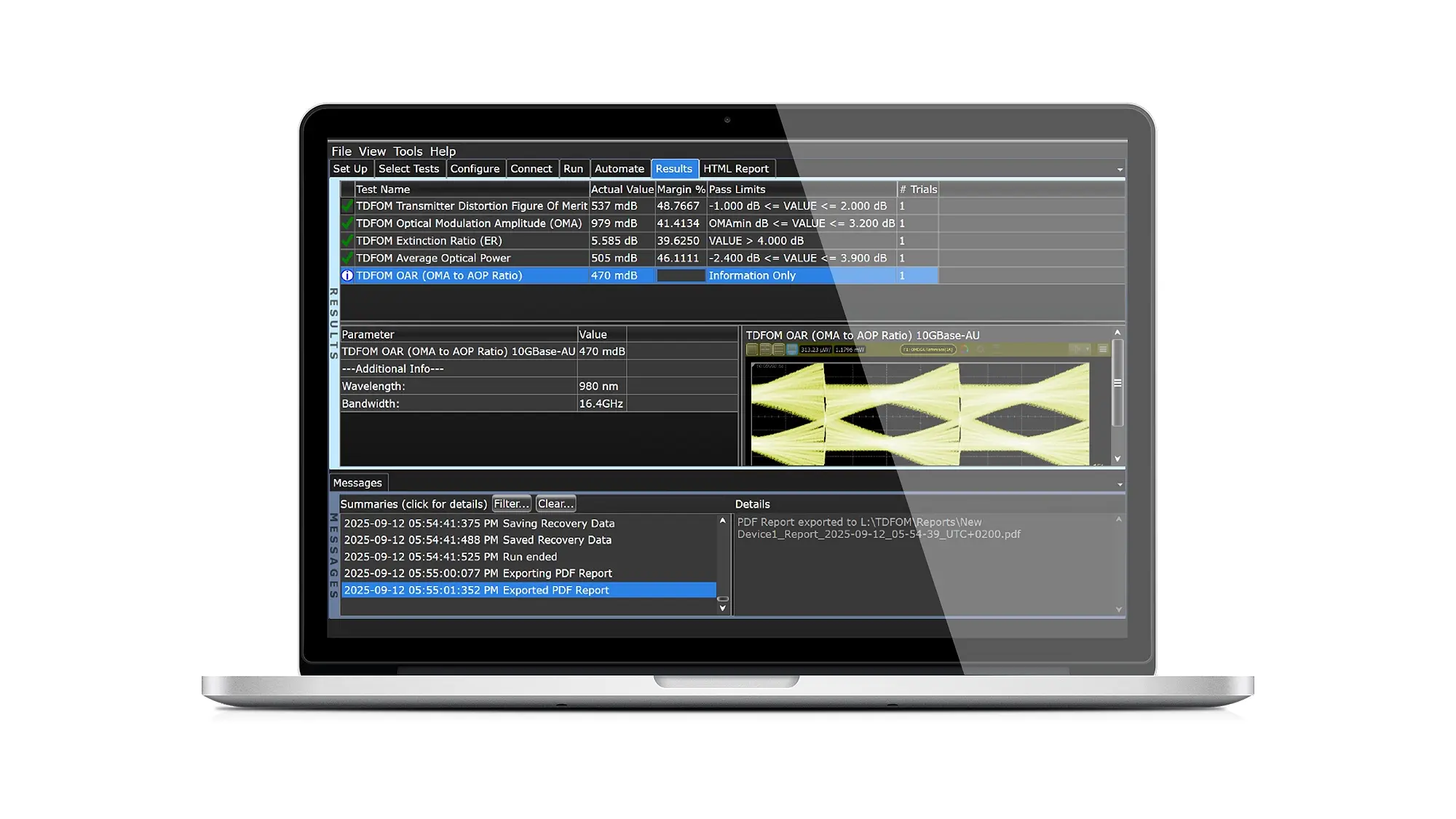 Die zweite Lösung ist auf optische Automotive-Ethernet-Verbindungen nach nGBASE-AU ausgelegt. Sie erfüllt die Anforderungen des IEEE-Standards 802.3cz sowie entsprechender Open-Alliance-Spezifikationen. Im Fokus steht die detaillierte Bewertung der Signalqualität anhand von Parametern wie optischer Modulationsamplitude und Extinktionsverhältnis. Die Testumgebung basiert auf Oszilloskopen der DCA-M-Serie und integriert Funktionen zur automatisierten Messdurchführung.
