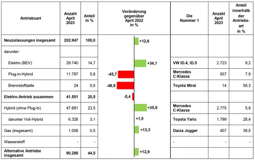 Wie das Kraftfahrtbundesamt (KBA) mitteilt, stand bei den Elektrofahrzeugen (BEV) im April 2023 der VW ID.4, ID.5 an erster Stelle, bei den Plug-in-Hybriden war es erneut die Mercedes C-Klasse. Der Toyota Mirai wies bei Fahrzeugen mit Brennstoffzellenantrieb wiederholt die meisten Neuzulassungen auf. Das zulassungsstärkste Modell der Antriebsart Hybrid (ohne Plug-In) war die Mercedes C-Klasse. Die Voll-Hybride wurden erneut vom Toyota Yaris angeführt. Zulassungsstärkstes Fahrzeug mit der Kraftstoffart Gas (insgesamt) war erneut der Dacia Jogger. Für die Antriebsart Wasserstoff wurden keine Neuzulassungen registriert. (oe)