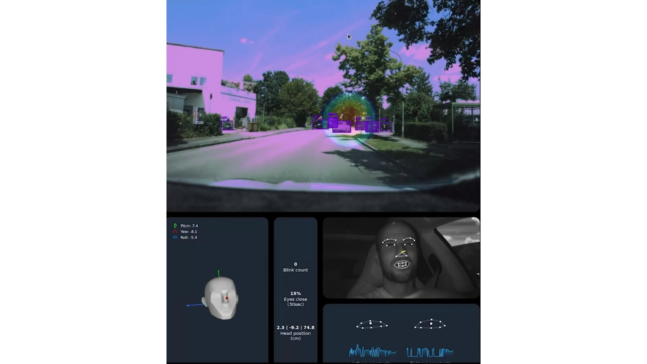 Mobileye DMS verwendet eine im Innenraum installierte Infrarotkamera, die mit einer Bildrate von 60 Bildern pro Sekunde hochfrequente Aufnahmen der Augen des Fahrers erstellt. Mithilfe KI-gestützter neuronaler Netze analysiert das System dann die Augenbewegungen und die Blinkgeschwindigkeit des Fahrers, um dessen Blick und den Grad seiner Aufmerksamkeit mit hoher Genauigkeit zu verfolgen.