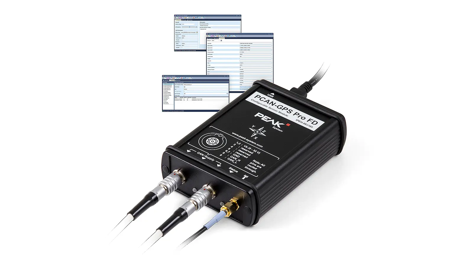 Die Übertragung der Sensordaten erfolgt über zwei parallele LEMO-Rundstecker wahlweise via CAN 2.0 A/B (40 kbit/s bis 1 Mbit/s) oder CAN FD (40 kbit/s bis 10 Mbit/s). Die Konfiguration wird über eine mitgelieferte Windows-Software via USB-C vorgenommen; danach arbeitet das Modul autark als CAN-Knoten.