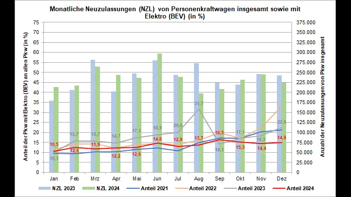 Neuwagen mit Elektroantrieb (BEV, Plug-in-Hybrid, Brennstoffzelle) machten dabei 572.672 Einheiten aus, was einem Rückgang von 18,2 Prozent gegenüber dem Vorjahr entspricht und einem Anteil von 20,3 Prozent am Gesamtmarkt. Insbesondere die Zulassungen von rein batterieelektrischen Fahrzeugen (BEV) gingen zurück. Mit 380.609 neu zugelassenen BEV-Pkw verzeichnete diese Fahrzeugkategorie einen Rückgang von 27,4 Prozent und erreichte 2024 einen Marktanteil von 13,5 Prozent. (oe)