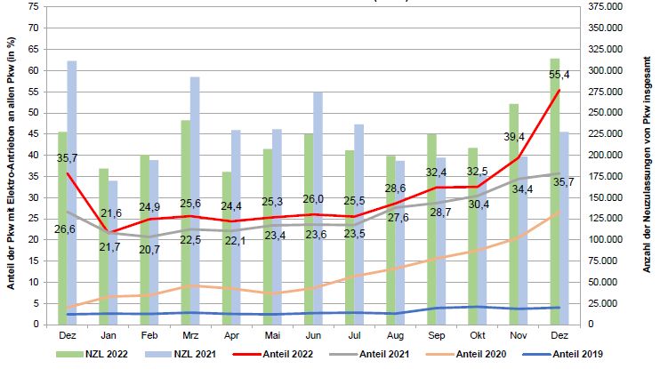 Mit 49,6 Prozent war rund die Hälfte aller Pkw-Neuzulassungen in Deutschland des Jahres 2022 mit alternativen Antrieben (Elektro (BEV), Hybrid, Plug-In, Brennstoffzelle, Gas, Wasserstoff) ausgestattet und damit 15,6 Prozent mehr als im Vorjahr. Wie das Kraftfahrtbundesamt in seinem Jahresbericht erläutert, stieg der Anteil der Neuwagen mit einem Elektroantrieb (Elektro (BEV), Plug-In, Brennstoffzelle) gegenüber dem Vorjahresergebnis um 20,8 Prozent und betrug 31,4 Prozent. Bei den Elektro-Pkw (BEV) führte die Steigerung der Zulassungen um 30,1 Prozent zu einem Neuzulassungsanteil von 17,7 Prozent.