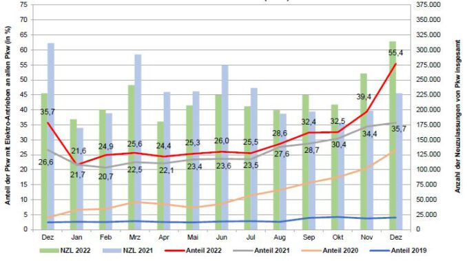 Pkw-Neuzulassungen mit alternativen Antrieben im Jahresverlauf 2022