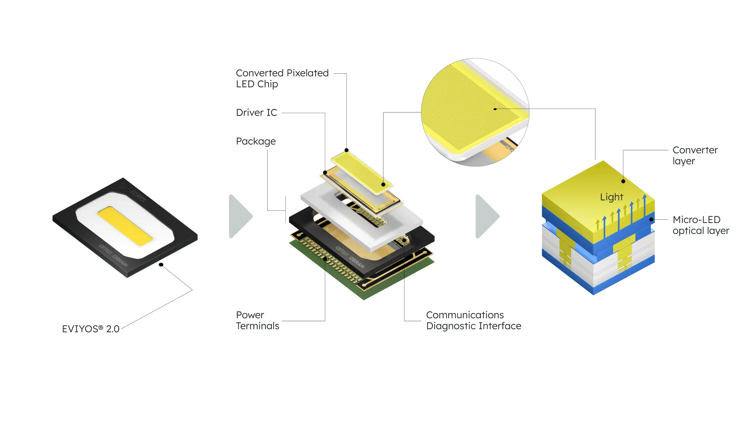Die intelligente Multipixel-LED EVIYOS 2.0 von ams Osram bietet eine hochauflösende, vollständig adaptive Fernlichtfunktion mit der zusätzlichen Möglichkeit, Bilder und Sicherheitswarnungen auf die Fahrbahn zu projektieren. Zugleich handelt es sich um die erste LED mit einem monolithischen Chip, der 25.600 einzeln ansteuerbare LEDs enthält. Die Serienproduktion soll noch im Juli 2023 starten. Zu den ersten Anwendern, die die neue Technik anwenden, gehört Marelli mit dem Headlight-Modul h-Digi microLED. (jr)