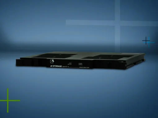 Die Wechselmassenspeicher x8 STORAGE Gen4 E1.S bewältigt mit seinen acht verbauten SSDs Datentransferraten von 96 Gbit/s in Kombination mit DATALynx ATX4 PCIe4 und 32 Gbit/s in Kombination mit BRICK2.