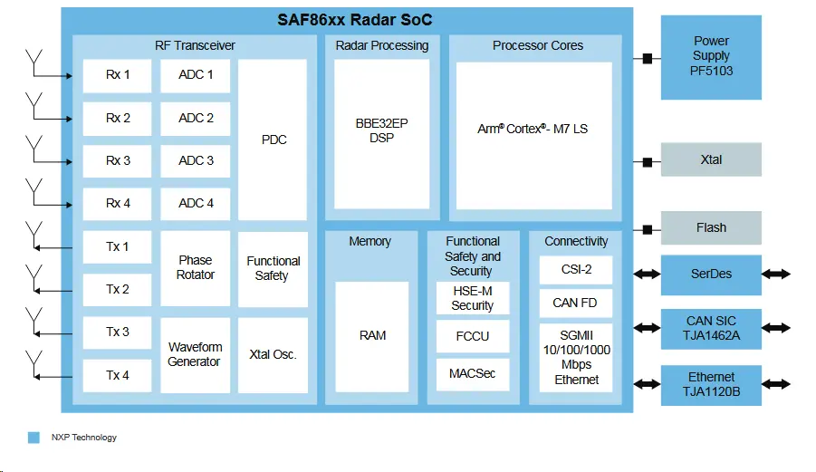Der neue SAF86xx integriert monolithisch einen hochleistungsfähigen Radar-Transceiver, einen Multicore-Radarprozessor und einen MACsec-Hardwarebeschleuniger für eine sichere und fortschrittliche Datenkommunikation über Automotive Ethernet.