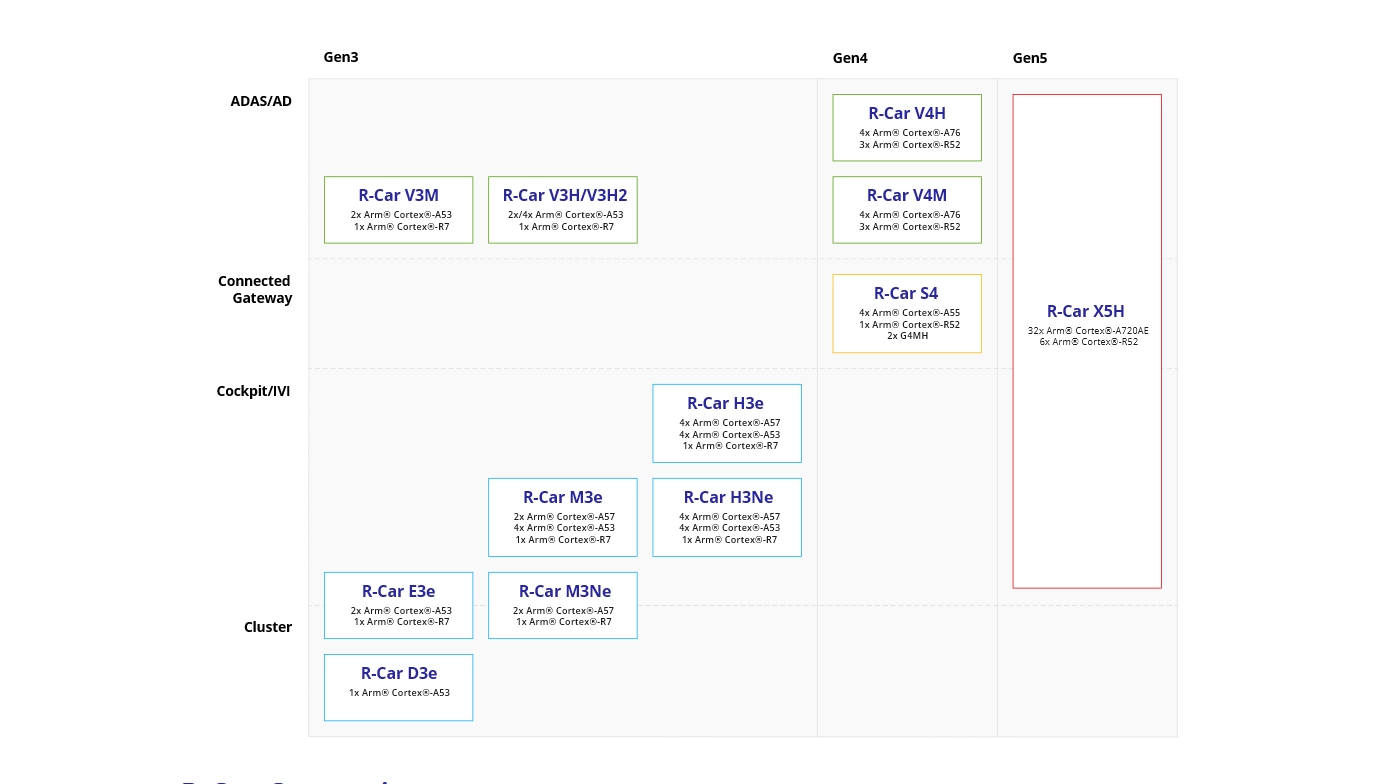 Als erster und leistungsstärkster Baustein der fünften Generation (Gen 5) der R-Car-Familie ist der R-Car X5H direkt auf die wachsende Komplexität in der Entwicklung von Software-Defined-Vehicles (SDV) ausgerichtet. Zu diesen Herausforderungen gehören die Optimierung von Rechenleistung, Leistungsaufnahme, Kosten sowie Hardware- und Software-Integration – bei gleichzeitiger Gewährleistung der Fahrzeugsicherheit. Durch die enge Verknüpfung von Anwendungsverarbeitung, Echtzeitverarbeitung, GPU- und KI-Rechenleistung, großen Displays und Sensoranbindung auf einem einzelnen Chip ermöglichen diese Produkte eine neue Klasse von Anwendungen für automatisiertes Fahren, IVI und Gateway.